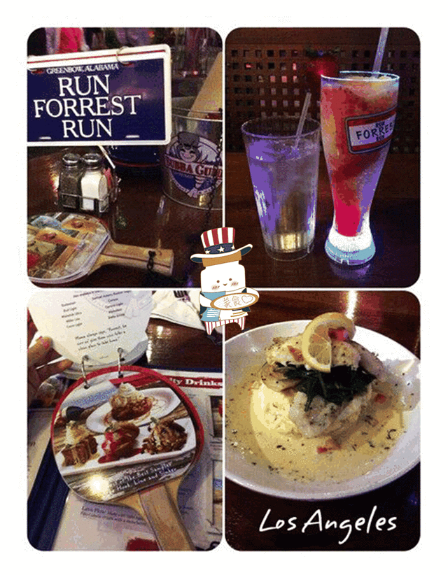 不知道《阿甘正传》的阿甘是不是真的来这里吃过饭,但这里无疑是人气餐厅。小哆请服务帮忙推荐几款特色好吃的餐,选了一款鱼(不知道是什么鱼)和一杯软饮(也不清楚是草莓味的苏打还是冰淇淋),类似Mojito的调制法,杯子在不停的变幻发光,餐后热情的服务员让小哆把杯子拿回去留做纪念(不过后来发现杯子底下标着made in china)。果然是人气餐厅,味道非常赞。主食+饮料+小费一共是37.17美元,感觉也挺实惠的。