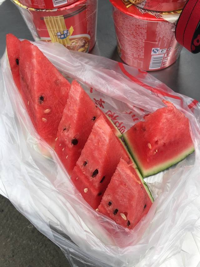 中天门路边吃个西瓜解暑,水分好足,而且很甜,不过口感略奇怪,不是爽脆的那种,有点软、绵......