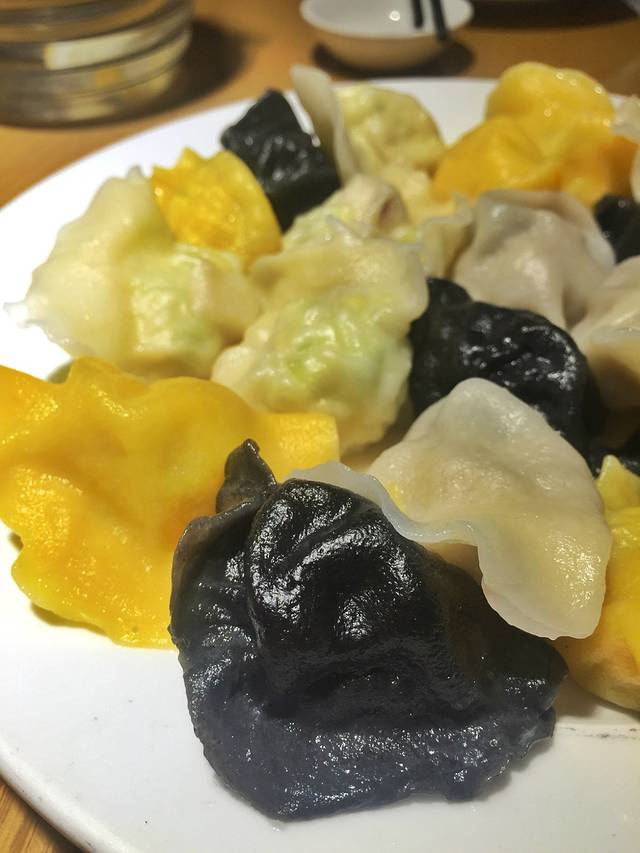 晚饭还是在附近找,最后决定去船歌鱼水饺。其实是冲着麻麻黑的墨鱼水饺来的,后来还是点了个全家福水饺,试试各种口味。这个全家福拼盘里有墨鱼、黄花鱼、鲍鱼和海参四种口味,一共20个,比较喜欢黄花鱼的味道,鱼肉味道明显而且鲜,墨鱼里是墨鱼丸,水饺皮是墨鱼汁染的,凑近闻就能闻到墨鱼汁的味道,感觉还是蛮新鲜实在的;鲍鱼和海参,馅儿里倒是有大块的,但是总体味道不是很鲜美,略淡。