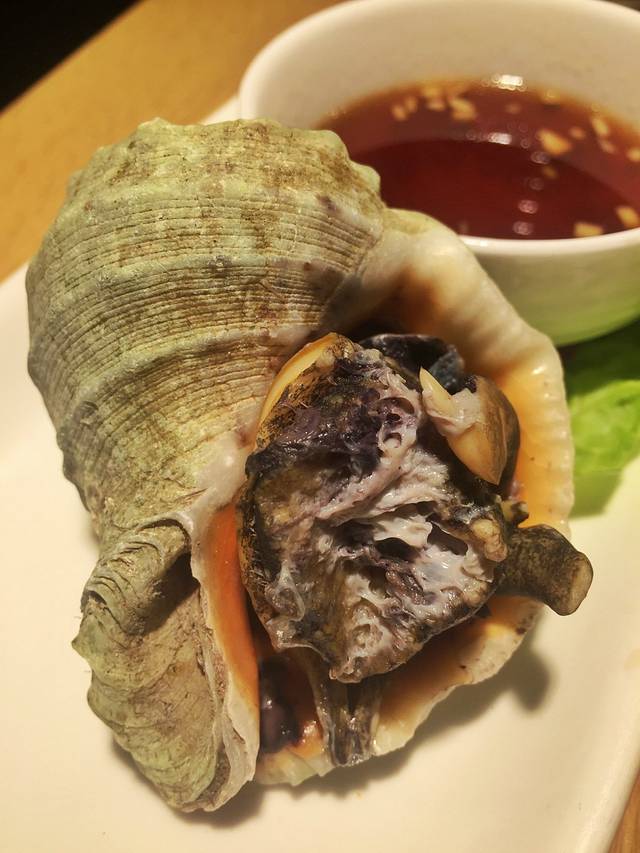 蒸海螺有点坑啊,一整只上来,配姜醋。海螺里面的肉没有处理干净,而且非常老,咬不动啊......