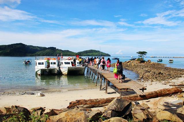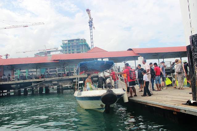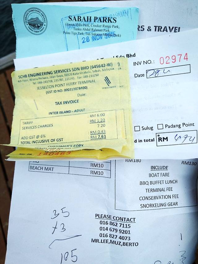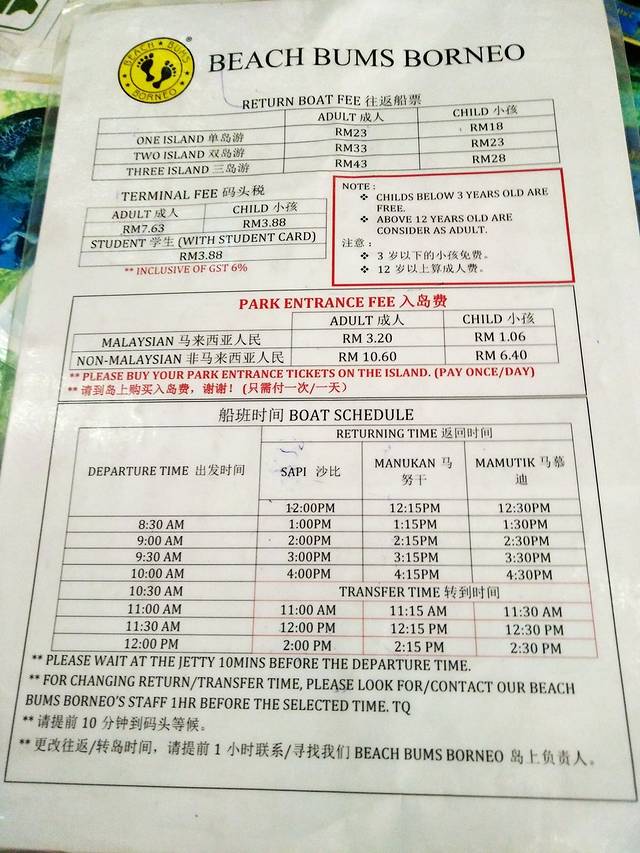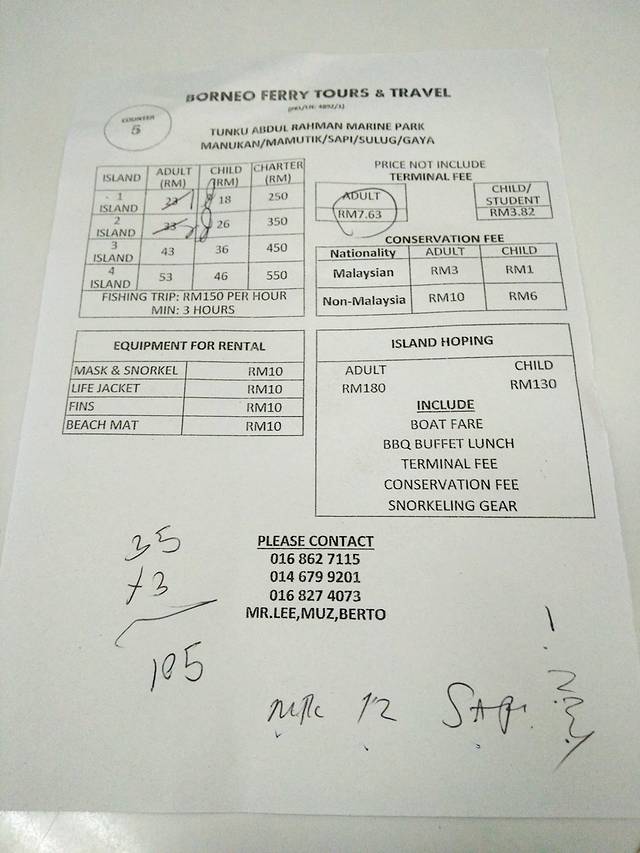 ▲选择套餐,单岛/双岛/三岛,价格不同,别忘了还价!这里交的是往返船票费跟码头税费,不含上岛费。上岛费上岛后交,10RM一人,交一次即可。宝儿爷选择的双岛,马慕迪岛和沙比岛,人均价格是33RM。