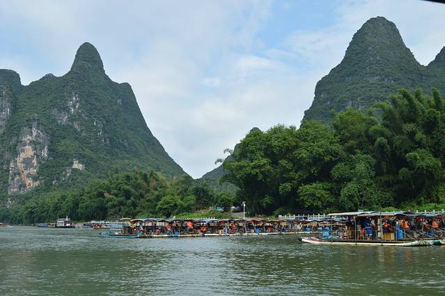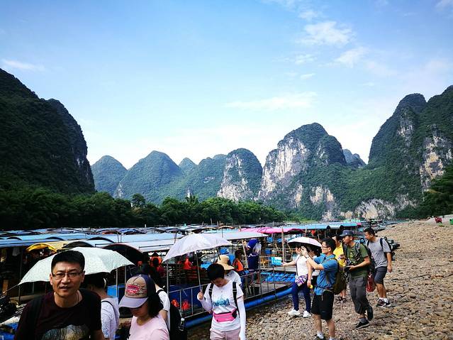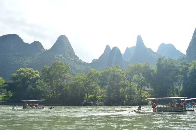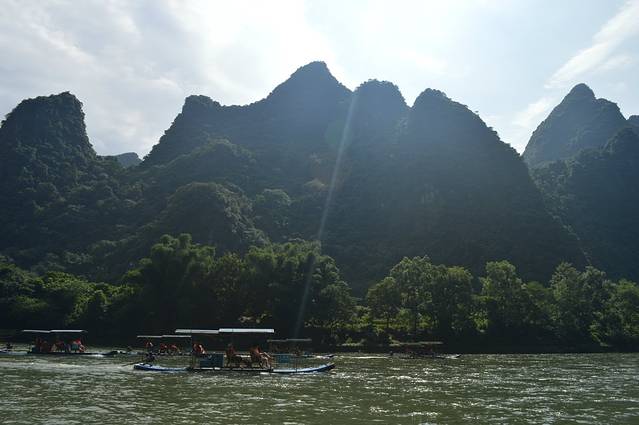 ps:我们有一段行程很奇怪啊,是因为迫不得已啊。一般而言,从杨堤可以直接漂流到兴坪,或是漂流到九马画山就可以做电瓶车去兴坪,但是!!!我们去桂林的时候,兴坪和九马画山的伐工在罢工!我们不能在九马画山下船,所以每个人要给师傅交10元的返程费用。返回杨堤。。。精华段其实是九马画山到兴坪。。。但是游船是不受影响的,因为公司管理制度不一样,客轮的线路和竹筏是不一样的。