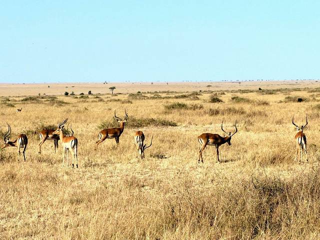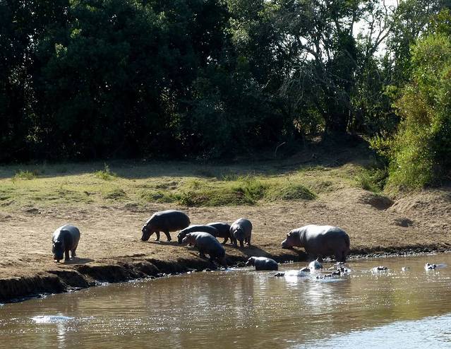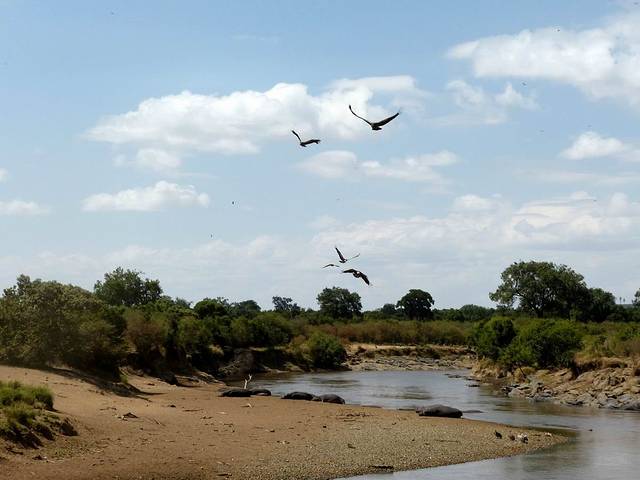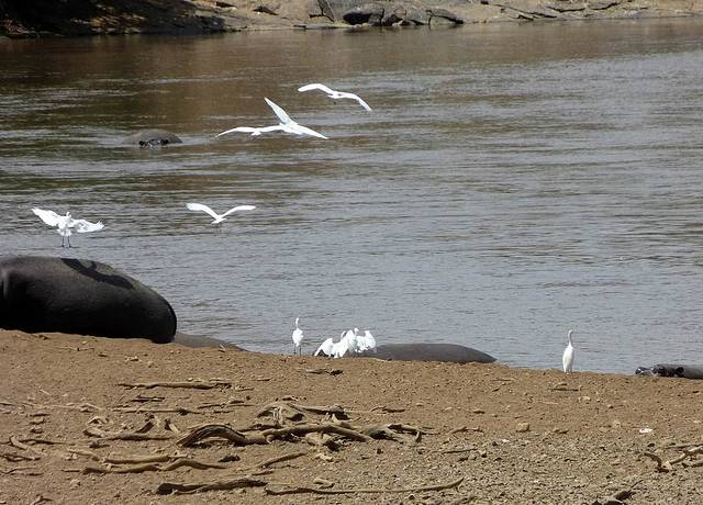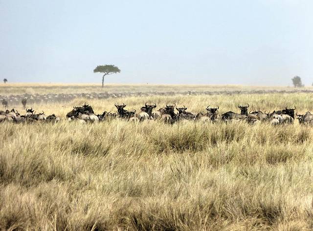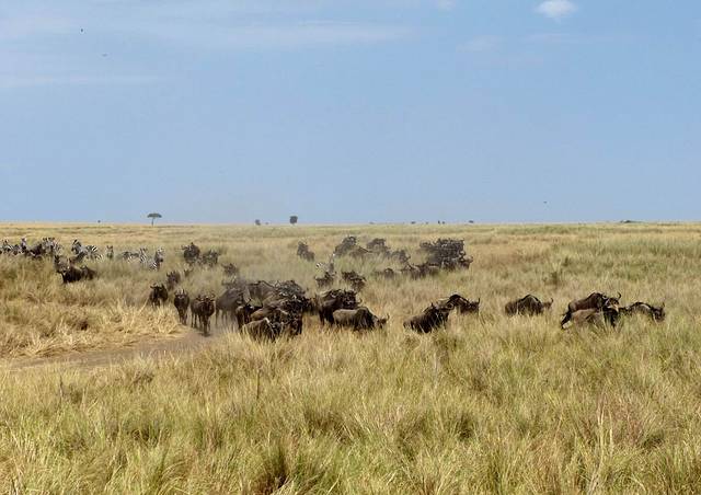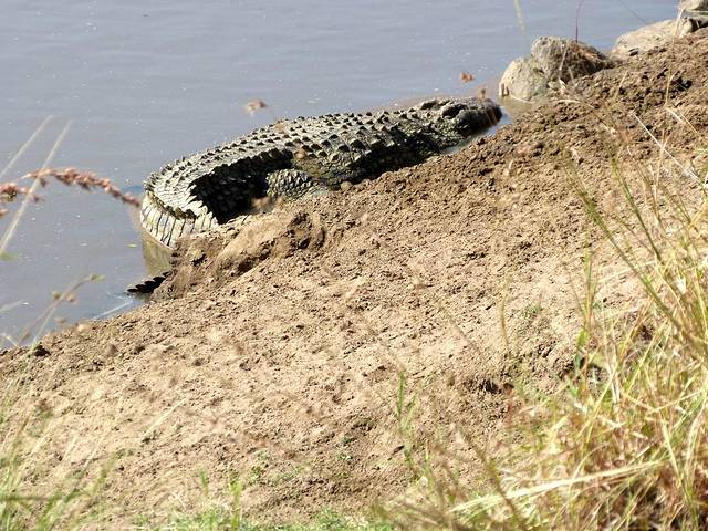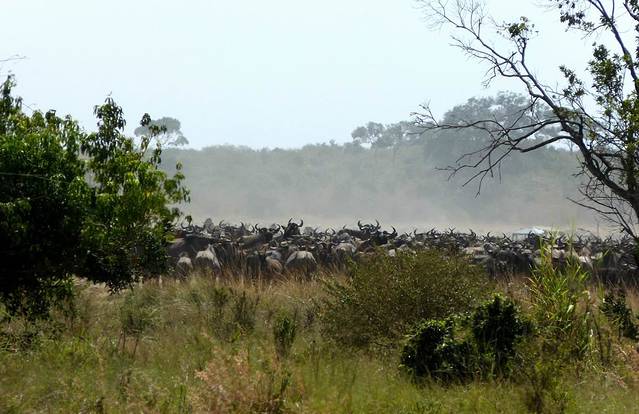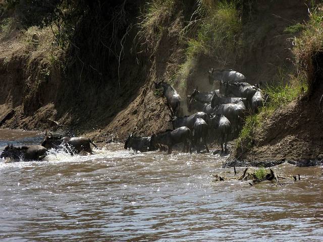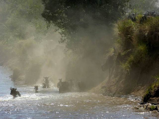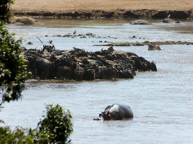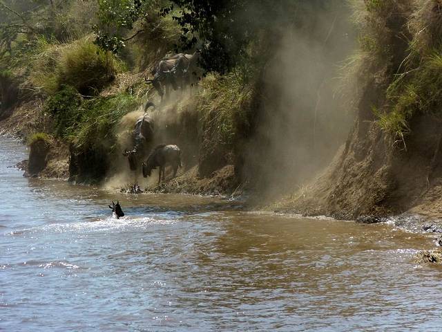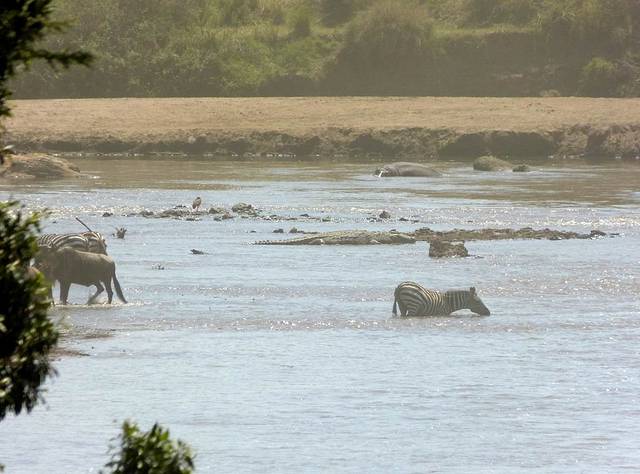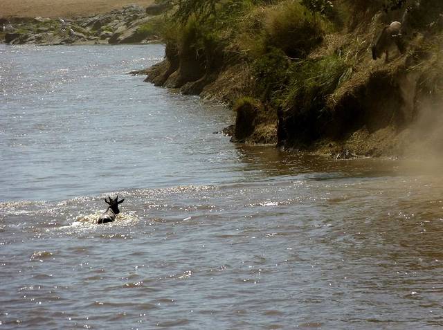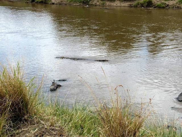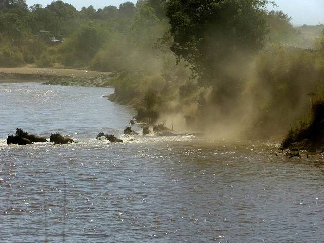 马拉河很长,蜿蜒在马赛马拉草原上,而且距离大部分酒店比较远,所以一般游客需要安排一整天乘车看动物。这天要带上午餐盒,上午从酒店出发,往马拉河方向,中午在可能的几个渡河点选一个守候。能否看到角马渡河,就看司机的经验和我们的运气了。据说,有的游客来了多次,也没有看到角马渡河。其中的一个重要原因是,白天天气炎热,鳄鱼潜伏在马拉河中,角马不敢渡河。角马一般选择傍晚天气凉爽,鳄鱼上岸休息时再渡河。而马赛马拉国家公园规定,游客必须在下午6时以前离开,只有获得特批的摄影、摄像人员才能留下。