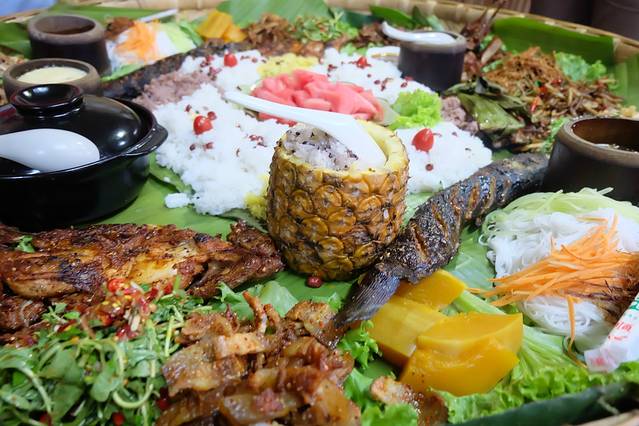 手抓饭是丽江纳西族的美食,用芭蕉叶当作盛装食物的“碗碟”,以手代筷,带上手套就直接大快朵颐了。光是饭就有好几种:紫米饭,白饭,稀饭,菠萝饭;烧鸡,烧乳鸽,凉菜。