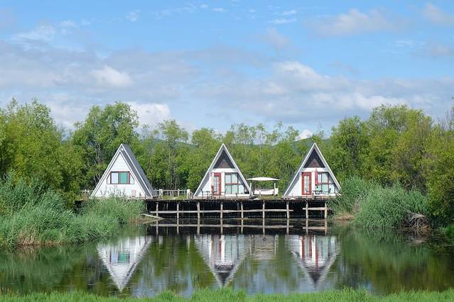 逸景营地湖边彩色的斑头雁套房,像是错入了童话小镇。周边的海景让人陷入无限遐想。