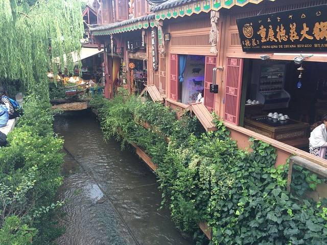 丽江古城(大研古镇部分),水草浮游在流水之间,旁边就是一间间古屋建筑。不管是交错的池塘还是民居下笔直的小溪,水清如镜,绿树倒映着涟漪。