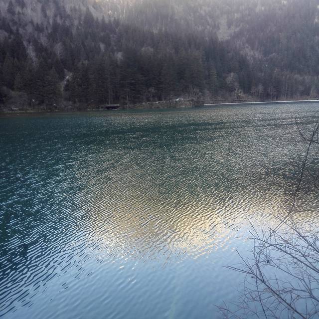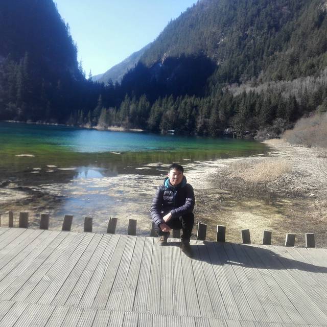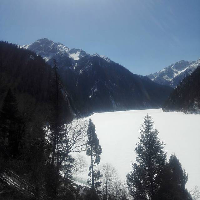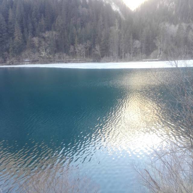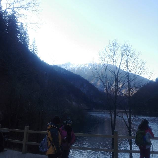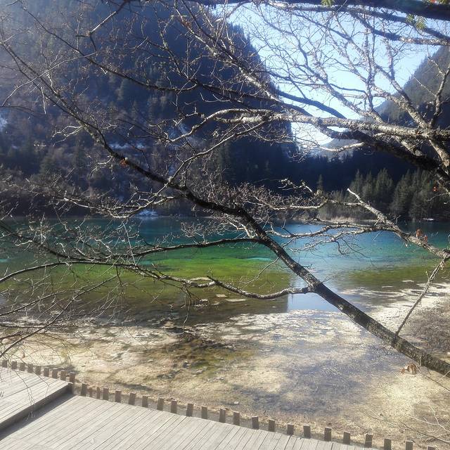 箭竹海水的颜色分明,湖边的颜色较淡黄色,湖主体的颜色是蓝绿色,颜色的程度又不一样,斑驳交错。在阳光的照映下,湖面光明鲜亮,与清澈的湖水发生美的化学效应,增添了几分神韵。再映衬上旁边的大山,林海雪原,还有丝丝的微风,这样的景色让人陶醉,这样的温度,这样的阳光,还有这样的微风,将人体的感觉调整到一个最佳状态,让人感觉春光无限,美不胜收。我靠在栏杆上,闭上眼睛静静地享受着这美好而短暂的安逸时刻。