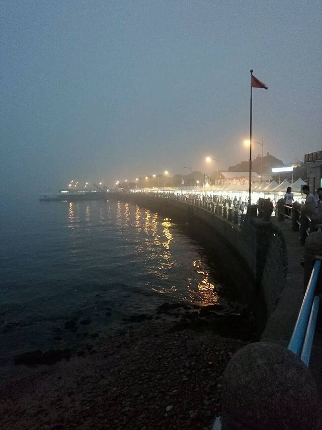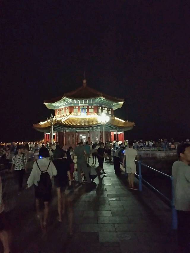 回澜阁,就是长得像古代的一个房子,我没有进去,晚上的时候人也很多,没什么好看的,也关门了,走过很长的栈桥,这是尽头,栈桥上来来往往的人很多,都九点多了,好像人们不疲惫一样,桥下的海水退了人们都在捡东西,不过听当地的人说,青岛的排水系统很好,德国人建的,而且像雨水什么的排到了海里,所以一退潮礁石上都是一道道的黑印子我就没有下去,其实栈桥实际上就是古代的货运码头
