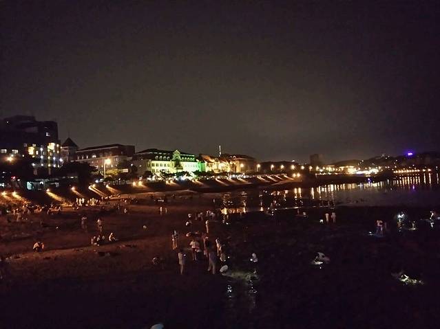 人很多,都是啤酒海鲜什么的,那里有卖各种口味的原浆啤酒,都是用塑料袋装的,应该很正宗吧,过了马路有一条很长的小吃街还有卖家常日用品的,再向前走还有卖吃的衣服的,有一家头上的拷粉丝真的很棒,尝尝去吧,很棒的呦,晚上有到十点的公交车到市中心,所以不用担心放心吃吧