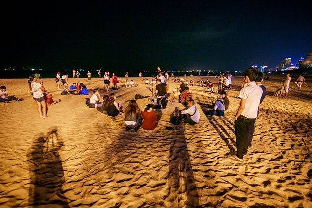 退潮时分,沙滩变的特别的宽。有一些玩音乐的人聚在一起,拿出吉他和音响,随心的唱了起来。陆陆续续多起了围观的人群,弹唱的人即兴的与路人玩起了互动,很有氛围。