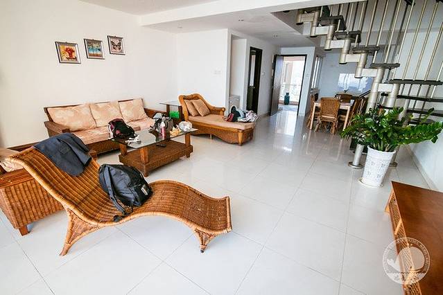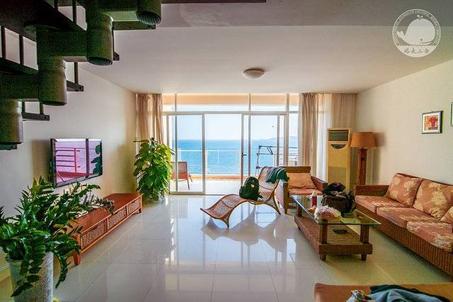 因为我们的特殊喜好——喜欢自己逛菜场买菜做饭,所以我们对住宿的基本要求就是干净、整洁、风景好,最关键的就是带厨房,可以下厨。提前在网站上反复观望了几家,最后因为最中意的那家被预定了,就选了备选的这家,顶楼复式跃层海景房,下层餐厅连着客厅朝海,上层一卧朝海 。房子很大,整洁简约,设备齐全,带厨房,锅碗瓢盆都有,如果担心卫生,可以先洗一遍再用。我们住的时候688/天,价格根据淡旺季会变,旺季888/天,过年七天3888/天。房东让我们叫他小郑,哎嘛, 即便在没有下单,只是询问,他也是热情的给我做了诸多介绍,必须五分好评啊,于是非常愉快的选择住这里。一口价,厨房、煤气、电费全部包的感觉很好(三亚有些短租房使用厨房是要另计费用的>_<)。无敌海景阳台看出去风景就是上面【关于住宿】的图,房间图我一会马上会介绍到。