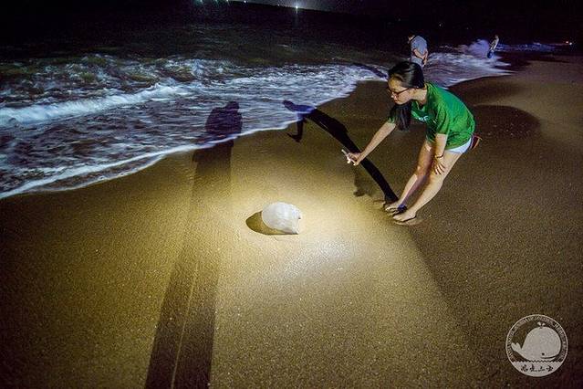 我们还在沙滩上发现了未知生物!起初还很纳闷,那么美的海滩,怎么会有人这么不环保,动不动就在沙滩上丢几个白色塑料袋。实在太气愤了,我们正想着去把它捡起来…猛然发觉有点不太对劲…呀,是个透明的物体,果冻一样的,哦~~原来是海蜇呀!