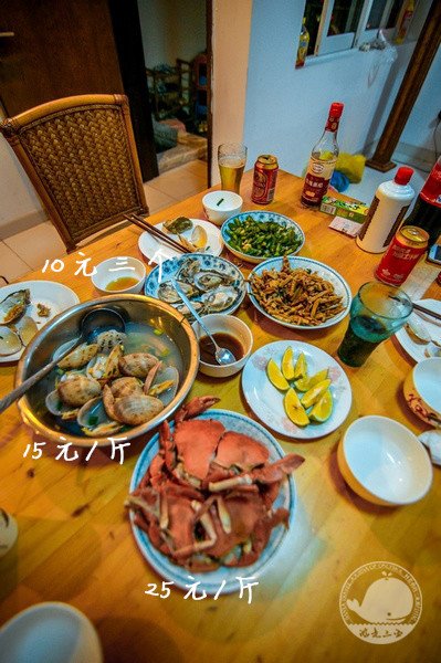 哦,开饭开饭。清蒸和乐蟹实在有点寡淡,陪着老爸的秘制酱汁,还是不错;葱油大对虾的口感超好,有葱油哦~竹蛏呀,活的时候很肉麻,吃起来味道是很鲜美的啊!听着潮声,看着日落,冰镇啤酒,饕餮大餐,完美(请自行脑补黄祖蓝模仿金星的动作)~