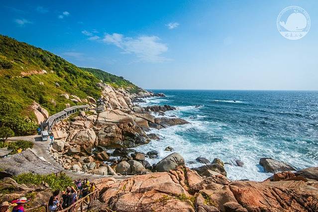 游览车行驶的是一条沿着山体边修筑的石板路,一边靠着山崖,一边紧贴大海,足以饱揽大自然的壮丽。对,是壮丽,这个词真的太贴切不过了。晴空、冽风、险崖、沧海。拍起的海浪直逼眼前,偶然还会溅到脸上,耳边的潮声不断,都无时无刻的不在提醒我们,这一切的真实。