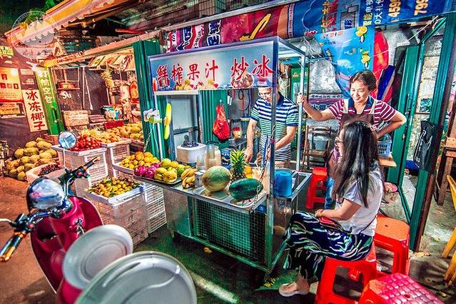 水果炒冰在三亚是很常见的,总觉得景点附近的会比较坑,所以选择了一家小弄堂口上的小店。10元一份,选两个水果。我们加了5元,选了三个,芒果+火龙果+百香果,就是那么任性○( ^皿^)っ 看到老板利索的将水果放到锅子里再加入炼乳和砂糖翻炒起来,一下子就变成了冰泥!我这种土包子简直惊呆了…为什么会炒着炒着会变冰泥呢?老板娘乐呵呵的跟我们解释,那个炒冰的锅子是速冻的,分分钟可以到零下90℃,所以自然而然就成冰泥咯。我一边盯着锅子一边连连点头。哦,这张照片上也出现了我们的神器——粉红粉红的小电动。仪表盘上被我套着塑料袋,因为仪表盘灯实在太亮了,晚上骑车简直闪瞎人好吗…