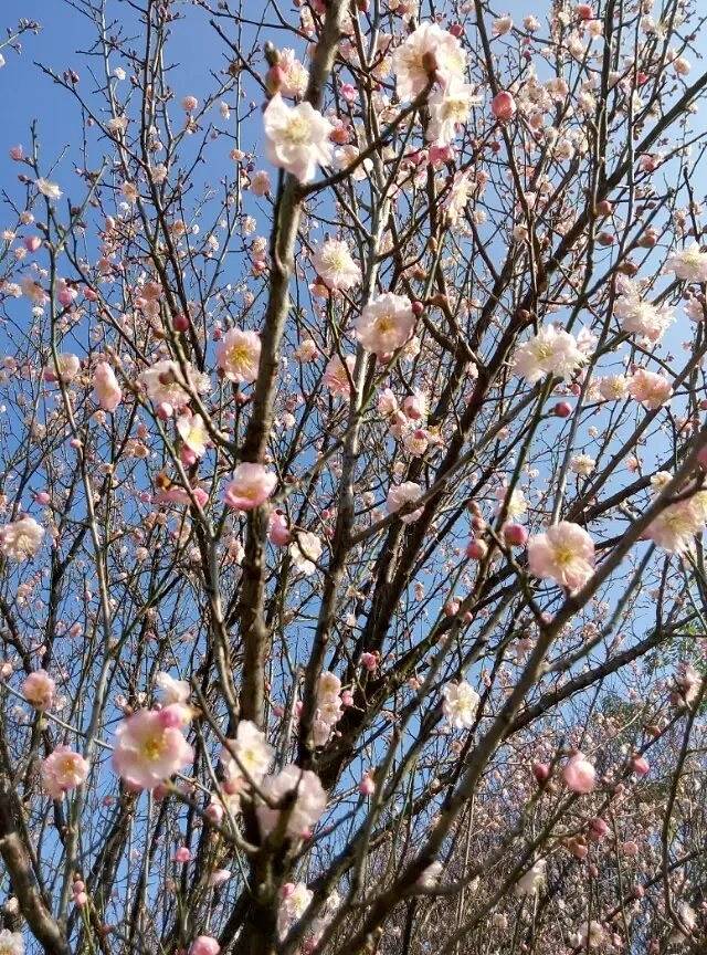 满怀憧憬的走进大门,在其右手边就是一排排开的灿烂的梅花,大多数是白梅,风一吹就散落出一幅幅美丽动人的画面。周围的游人都想抓拍下那一刻的美。