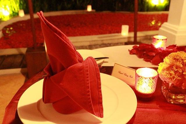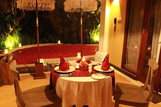 我们在叶子酒店定的是两晚的蜜月套餐,除去标准福利外,还有抵达时的蜜月蛋糕、30分钟2人抵达时足浴、1次2小时水疗、1次烛光浪漫晚餐,1次午餐、每日免费迷你吧、每日酒店饼干、每日新鲜水果篮、在别墅每日早餐、每日下午茶服务。也算超值啦!丧心病狂的玫瑰花瓣铺满整个泳池,浪漫到极致了