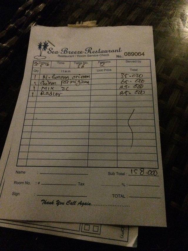 我们让酒店帮我们叫了一辆出租车,也不算是出租车,是不打表的,酒店给我们的价是单程50 000rp。但是我们上车后,和司机商量了一下,回程也是找他接,80 000rp包来回,司机很爽快的答应了!