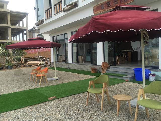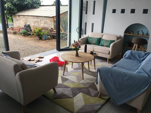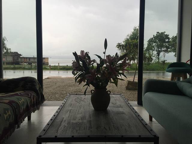 比如左手边的这个休闲区,别看它就是一套沙发茶几,坐在沙发上,刚好就是最好的观海视角,坐在这发呆看海,听音乐,店长还说天气好的时候傍晚夕阳格外迷人,因为这个地方正好处在日出的位置,对面当然就是日落的地方。最近天气有点阴,感觉也看不到夕阳了,不然还是想试验一下的。