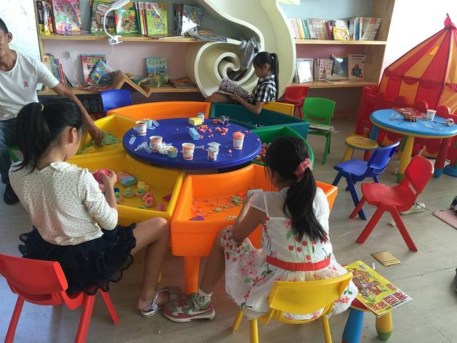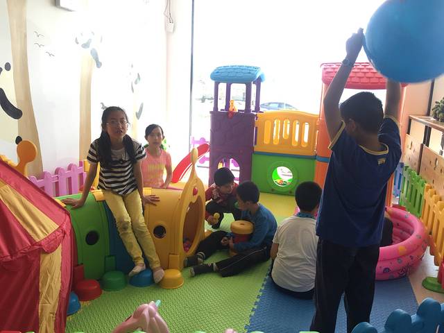 大厅中间还有个DIY区,有的孩子爱动,有的孩子好静,像宝贝米她就不喜欢玩什么滑梯,可能女孩子都比较喜欢做做手工吧。店长还给她拿来了橡皮泥和积木,还有剪纸材料包,真觉得,小孩在这里光是和店长就能玩一天了。
