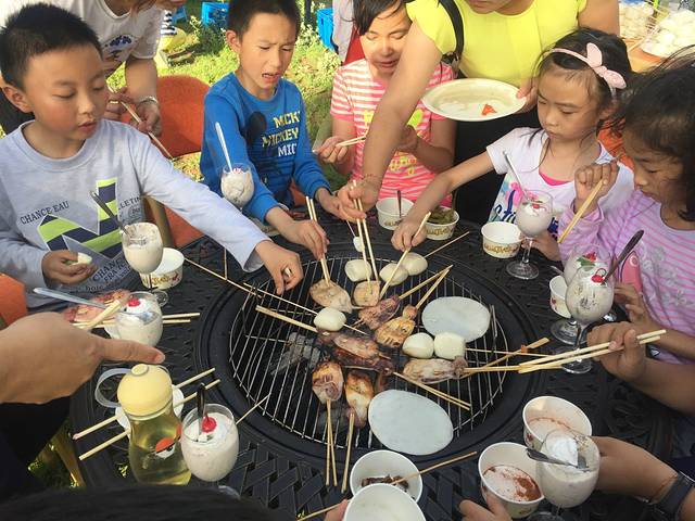 人多干活就快,二十几个人的烧烤,一会就收拾好啦。在海边,放好桌椅,架了几个烧烤架,几个孩子自己一个大人们一个,酒店给我们送了饮品,香浓纯厚的混合奶昔,孩子的最爱啊,当然也不会少了老爸们的啤酒和老妈们的果汁。虽然简陋,但是烧烤的美味是感动的味道,一群原本不认识的人,因为一家叫香蕉船亲子海景酒店,变成了老友。