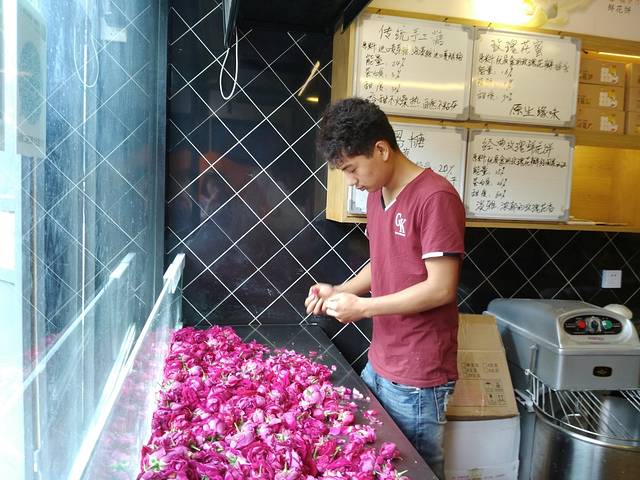 客栈门口有家餐馆,晚上人好多,看看门口摆的菜还是很新鲜的,大理的餐馆有个特点,都是看菜点菜,有大理特色的野菜,有野生肥鱼,螺蛳,当季特产野生菌,还有各种时蔬,连玫瑰花瓣都摆出来了,看得我们都眼花缭乱的。最后在店家的推荐下,点了一份海菜芋头汤、酸辣鱼,玫瑰鸡蛋饼,还有一个炸乳扇。