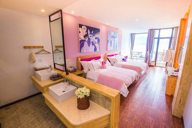 参观完大厅,店长给我们介绍起房间来(他还真是个风趣幽默,能说能侃的正宗东北人啊),他们的房间都是有不同主题的,女孩嘛,推荐住粉红色小马屋。不得不说,酒店外观好像跟其他家酒店没什么区别,但是房间的设施确实让我们眼前一亮呢。就说卫生间吧,干湿分的,卫生间和淋浴间是分开的,洗发水和护发素都是日本海购来的资生堂,沐浴露也是适合大人和小孩用的温和型。