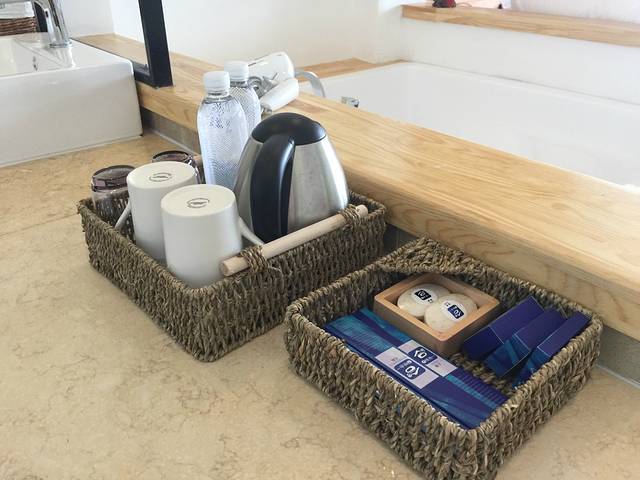 一次性洗漱用品在盥洗台的上,量都很充足,连小孩的份都算好了,值得一提的是拖鞋,住五星级酒店都没穿过底这么厚的拖鞋,而且也是干湿分开的。有点累,一屁股坐在床上,连床也是好软好舒服啊,床垫和床单被罩都是泰国进口的,亲肤性和舒适感都很强。阳台旁边放着一个衣架,看起来很普通,其实是香樟木的,据说衣服挂在上面,会有香味。