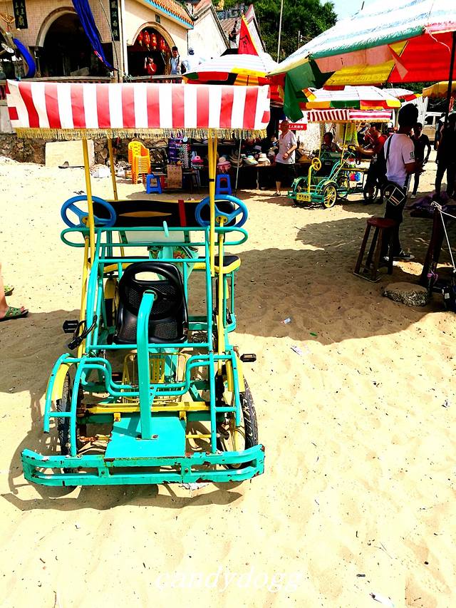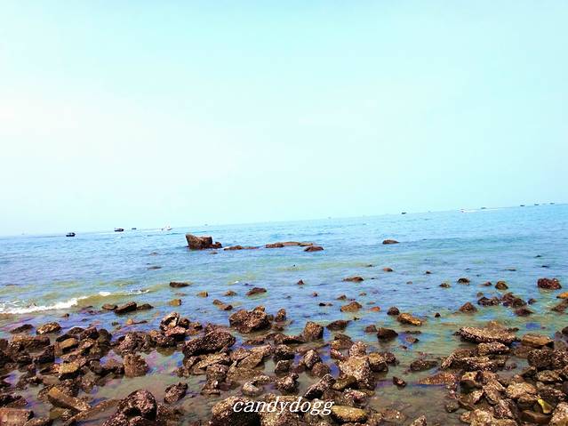 个人特别推荐去的是冠头岭海滩,这里是北海唯一有海拔、有礁石的地方,整个冠头岭看起来像一条青龙,当地人说是龙脉,所以推荐我一定要去看看沾沾龙脉的福气。这里有一大片海蚀平台和礁石,还有一只石头做的大乌龟,上面顶着大石写着“海枯石烂”,好多恋人在这里系上红丝带祈福自己和爱人的感情可以海枯石烂。最棒的是这里有一大片的海蚀平台,错落的礁石之间,有好多螃蟹、小型的贝壳和生蚝,小小的积水坑里甚至会有成群结队的小鱼,可以买铲子和小桶来这里一展身手,看看谁抓的螃蟹和找到的生蚝最多,呵呵。