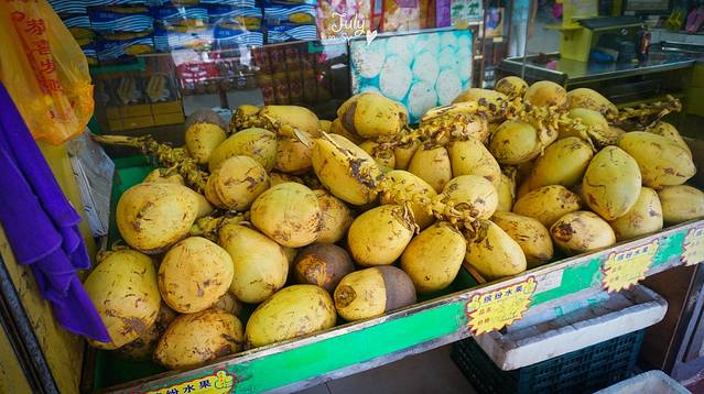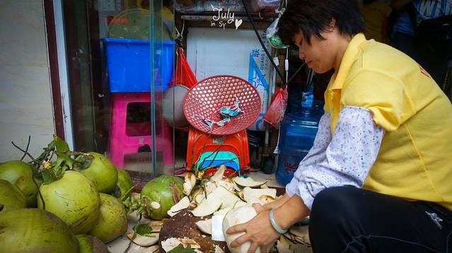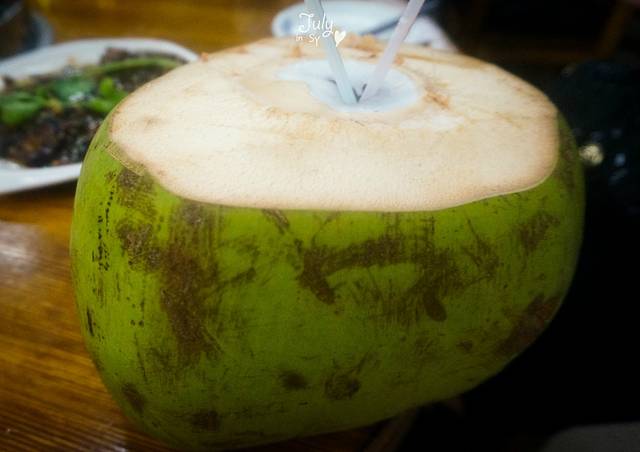 买完海鲜,让门口砍椰子的大姐帮忙挑了一个号称整框里最甜的一个。