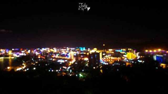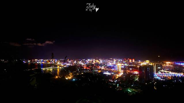 坐上观光车,风迎面吹,盘着山路上去,三亚灯火通明的夜景满满呈现在眼前。