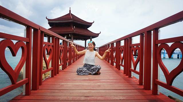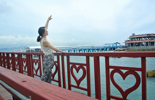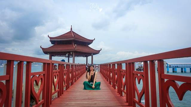 沿着路走,就看到了传说中的爱情桥,一座深入海里的木栈桥。这里是凹造型的好地方,于是我们又顶着热一顿狂拍。