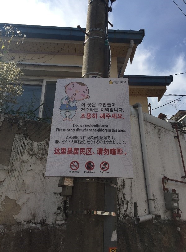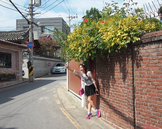终于走进了韩屋区域了,看着路上的标牌,我们也激动不已。这里其实很大,我们刚刚走的也是北村范围,但是要找到韩屋区域,还要费些功夫。实际上,有个小诀窍,跟着旅游团的小旗子,你一定可以找到韩屋区域的。O(∩_∩)O哈哈~