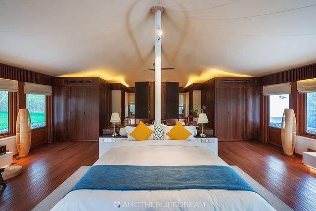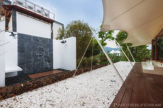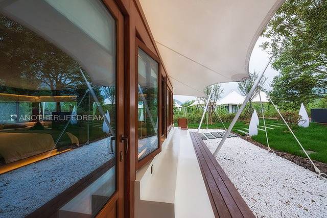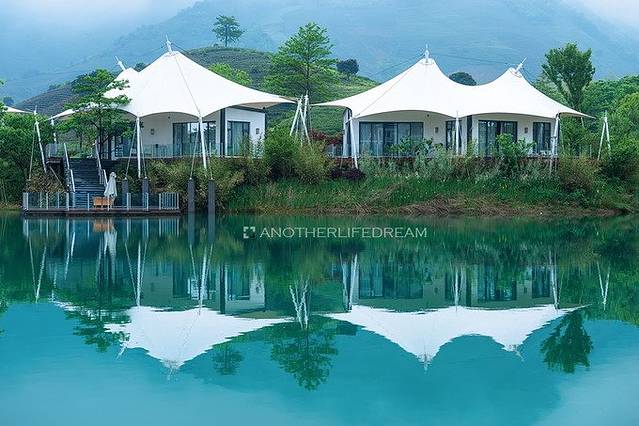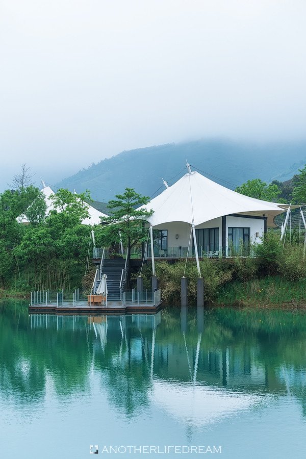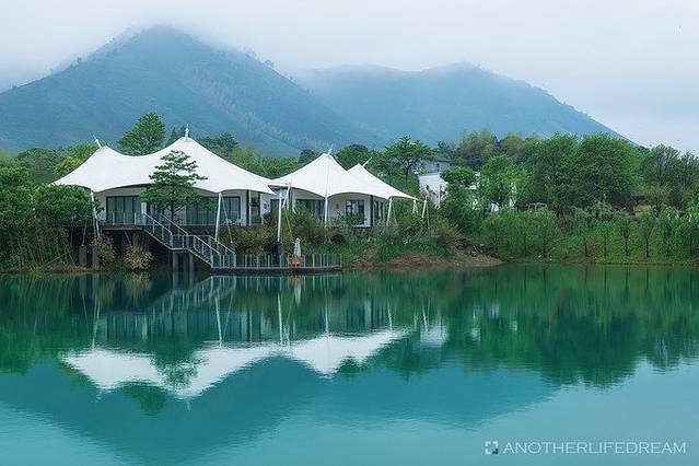 帐篷客实如其名,以白色的帐篷为特色,几顶帐篷式的客房点缀于茶谷的山坡和碧潭之间。