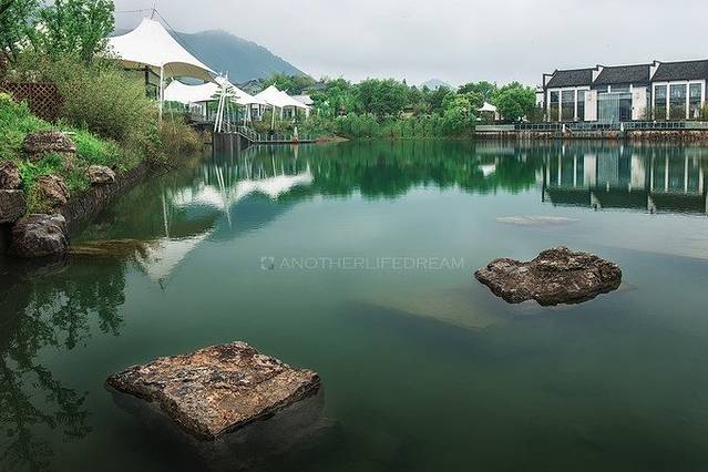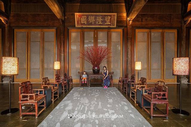 酒店大堂位于茶谷最低处的水畔,以徽派风格的谭府为主体建筑,兼有茶室、儿童活动区等设施,为数不多的几间徽派客房也在其中。