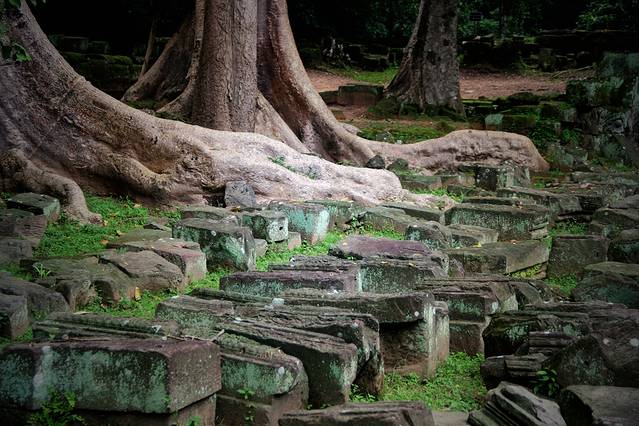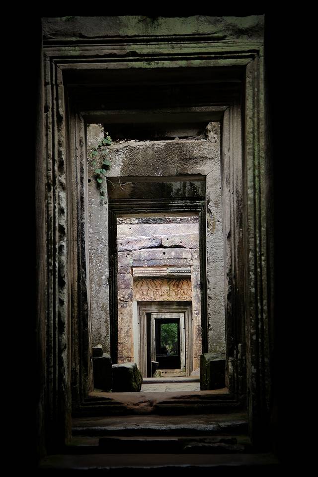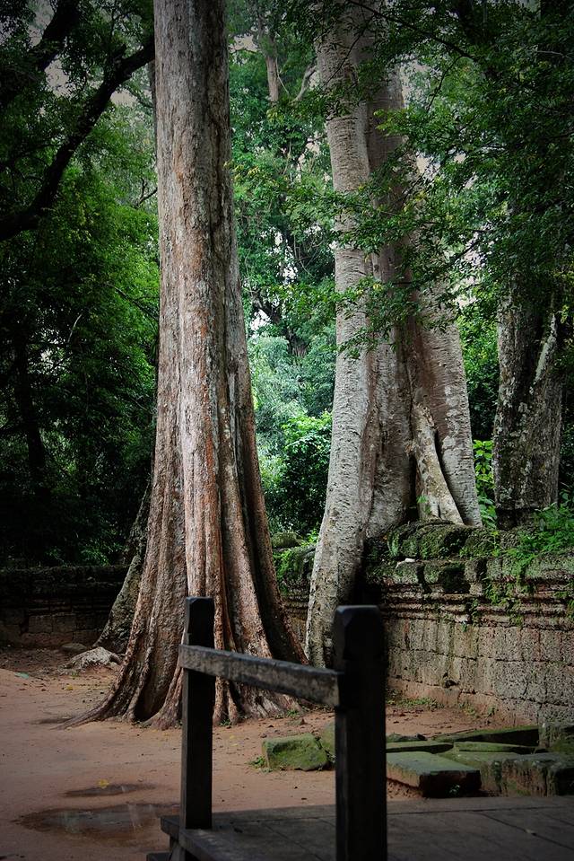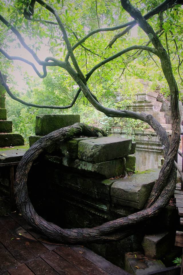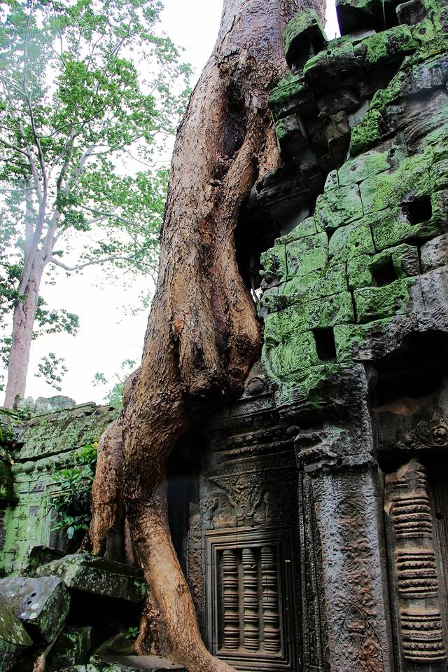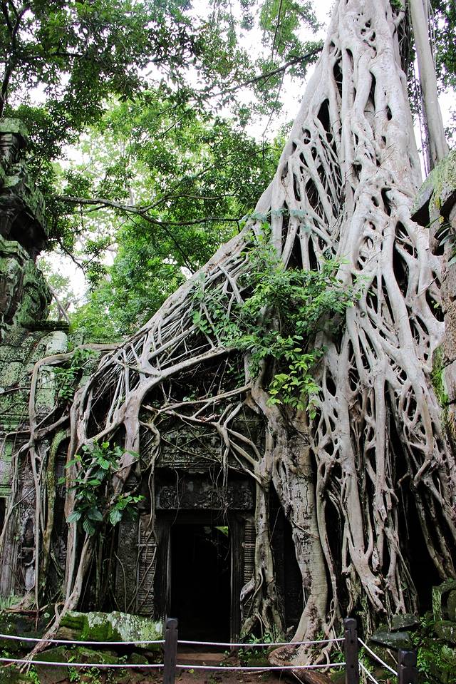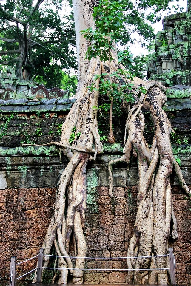 它们粗壮发亮的根茎,绕过梁柱、探入石缝、盘绕在屋檐上、裹住窗门,由一颗不起眼的小种子开始,历经数百年的努力,深稳紧密地缚住神庙,让枝干有力地向天攀升。