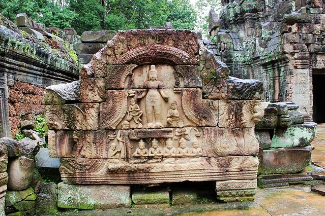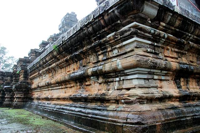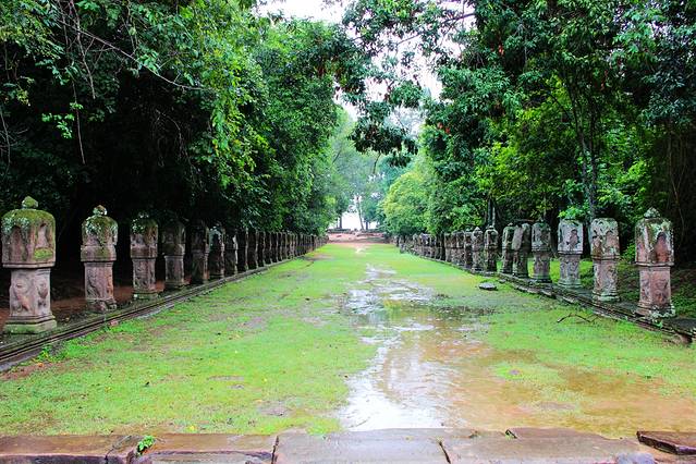 通往寺庙有四条路,在寺庙的门口立着数尊手拿长蛇搅动乳海的众神与阿修罗,在东西两边,有一列长的砂岩石莲花墙,而莲花上曾经有佛像,但在湿婆派主持时,他们被毁坏。