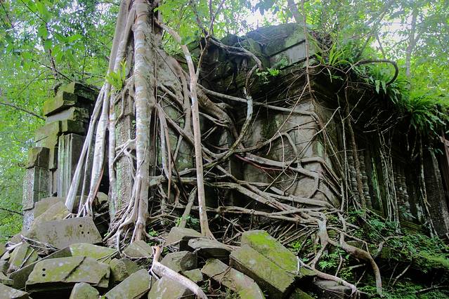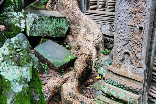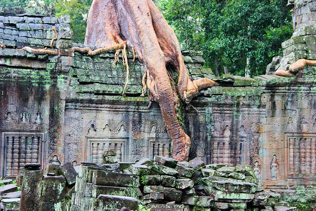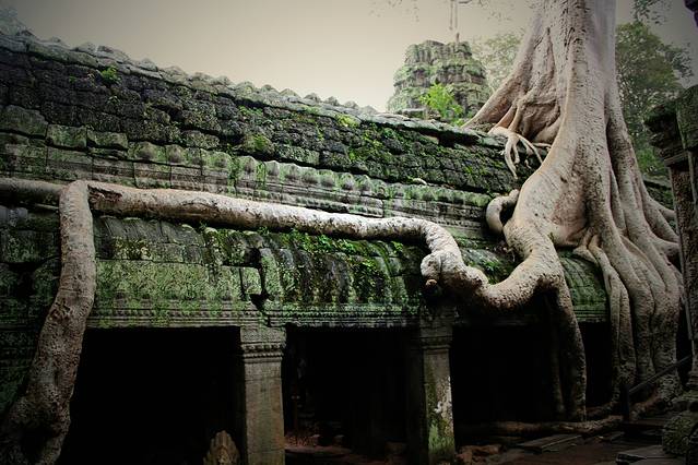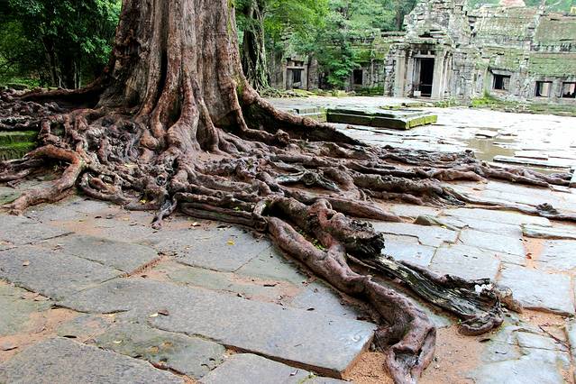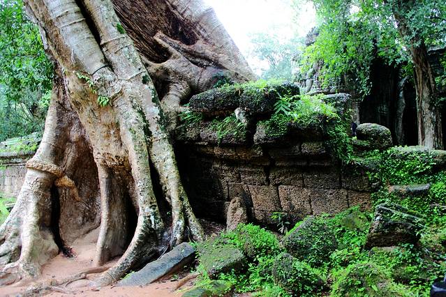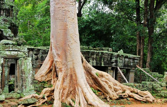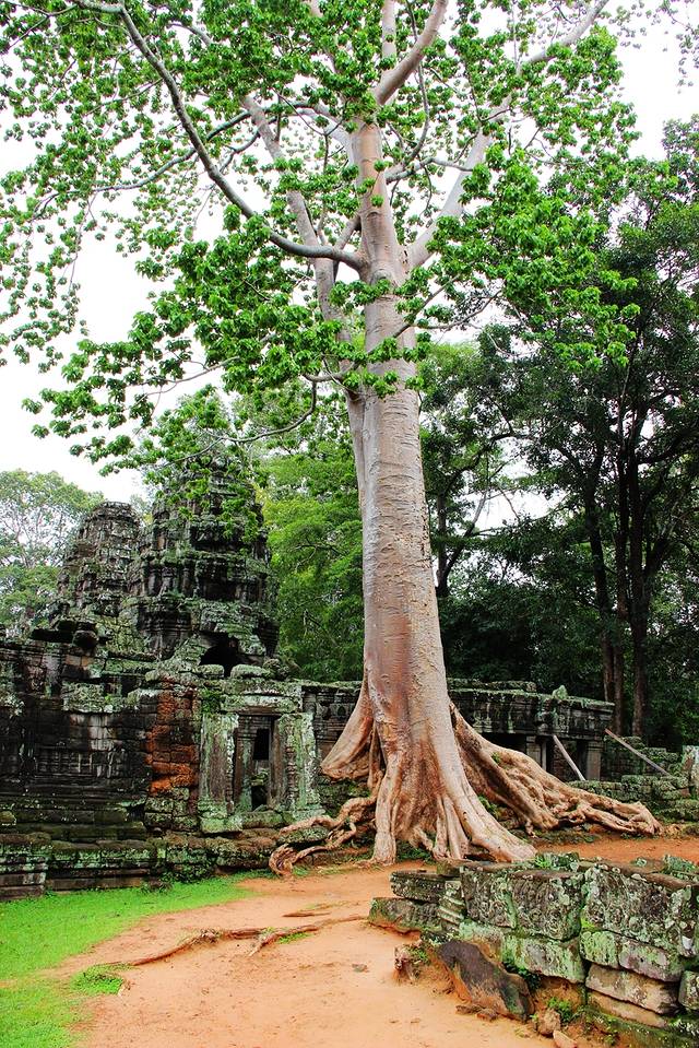 紧紧缠绕寺庙建筑的树叫吉贝树,根系既粗又壮。考古学者指出,古树的生长速度最终会使寺庙成为一片废墟。