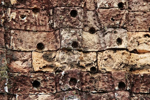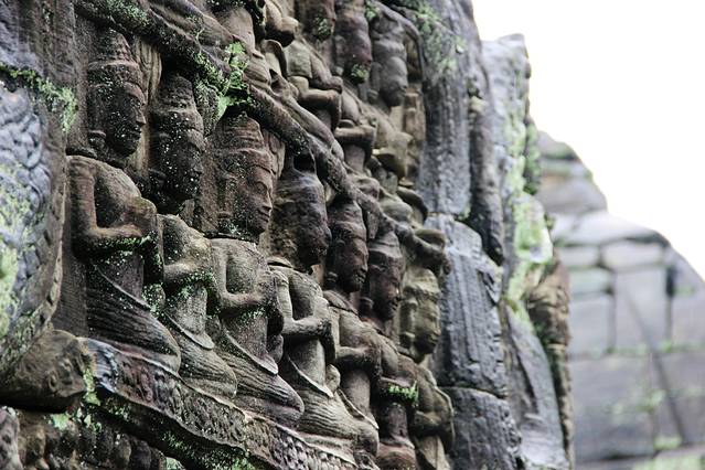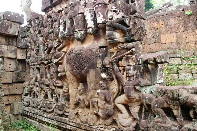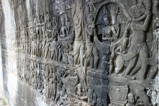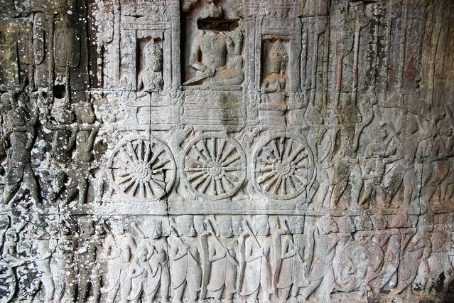 底层浮雕从东门开始顺时针行进,可以看到下面这些故事:出征占婆-林迦崇拜-水战--水上生活-赢得胜利-斗鸡和下棋-军队-内战-大鱼吞羊-胜利游行-马戏团-占婆人洗劫吴哥。