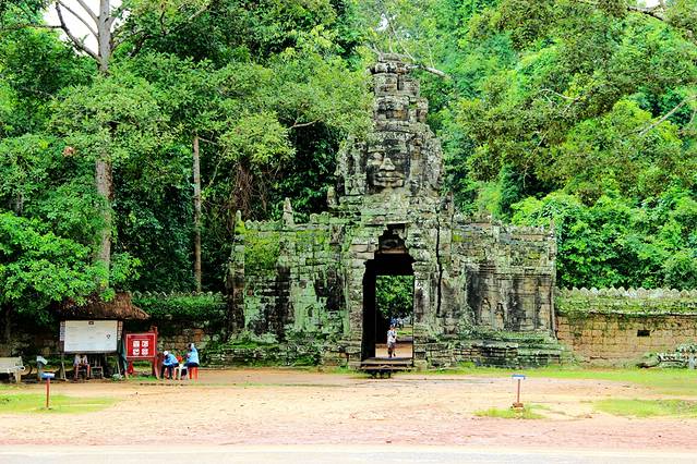 在寺庙的东西两侧各有一个入口,是呈十字形的石塔门,石塔上四面各刻有佛脸,类似于通王城城门上的四面佛。
