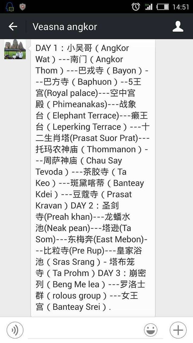 暹粒旅游已经基本成熟,一般自由行三日玩法都是三个圈,即小圈/大圈/外圈,每个圈一日,稍后再po具体行程。所以在搞定机票/酒店/签证之后,接下来就要解决当地交通问题啦!远在千里之外,如何联系当地司机?在几年前确实很麻烦,如今只要打开微信加个好友就可以了!网友写于各大旅游门户网站的很多攻略都有关于柬埔寨暹粒旅游的司机推荐,找一下看看哪个合适自己,然后再用微信号联系司机,与其细谈约定吧!