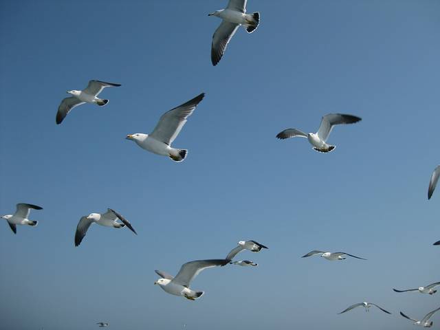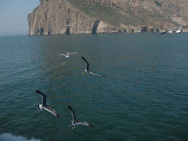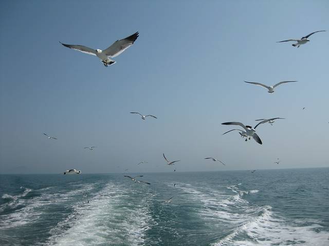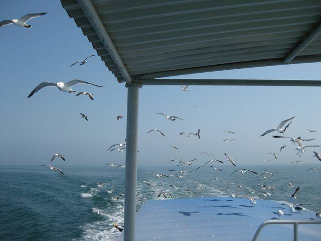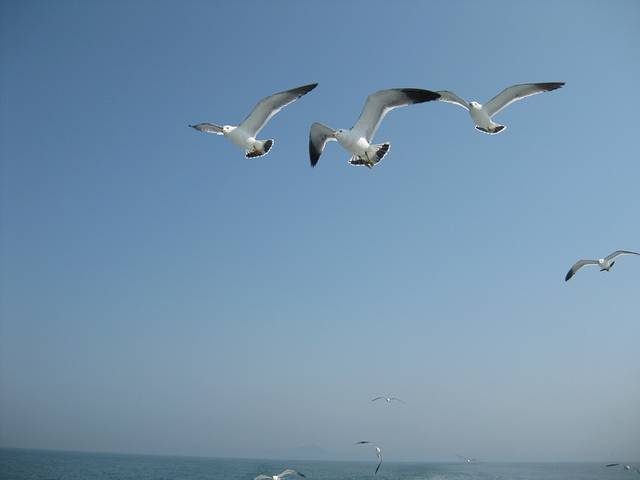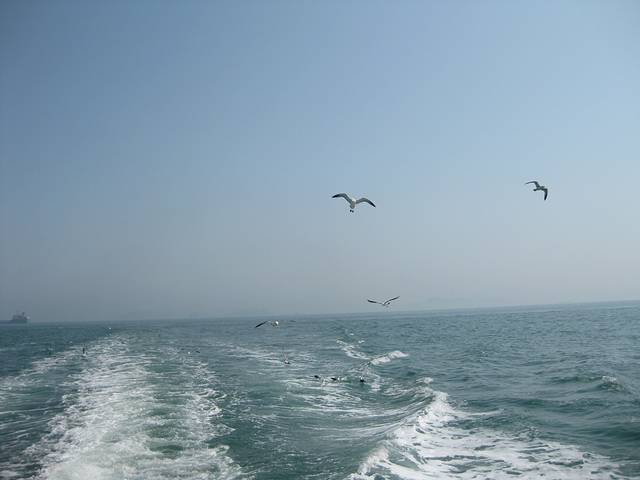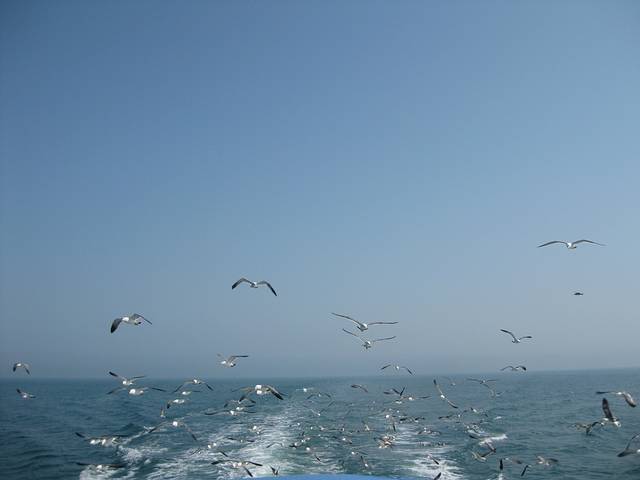 从船开动,陆陆续续的就有海鸥跟上来了,越来越多。记得买方便面啊,渔家乐旁边的小商店就有,它那个包小,买个30多包也不算多。喂海鸥喽