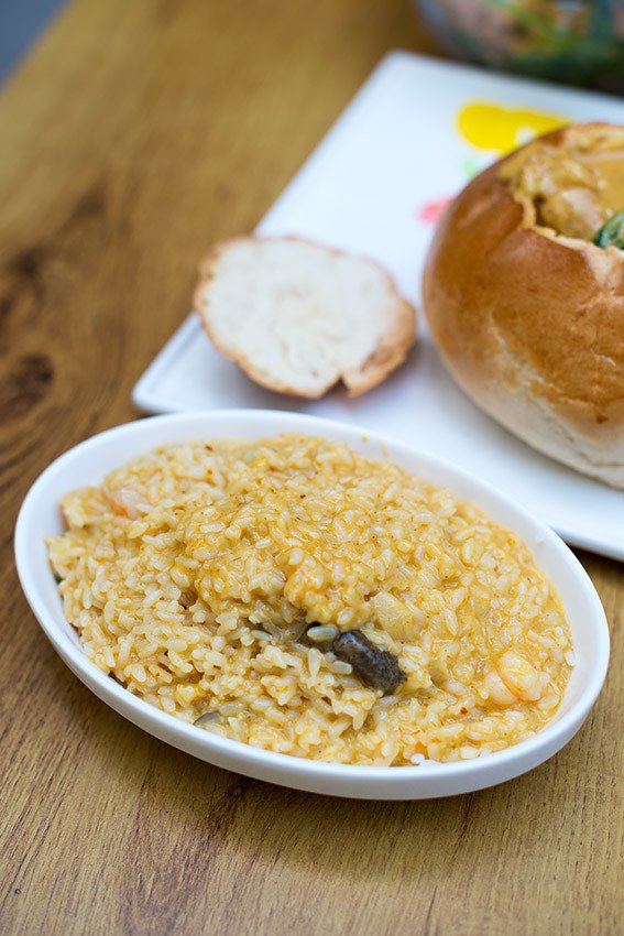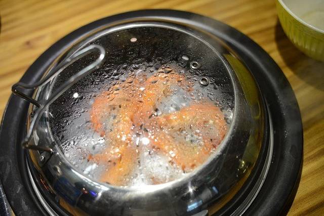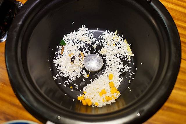 锅底是粥,随着一轮轮海鲜的蒸上游,不加水的粥完全是靠着海鲜的蒸汽,混合和海鲜的鲜美出炉的。
