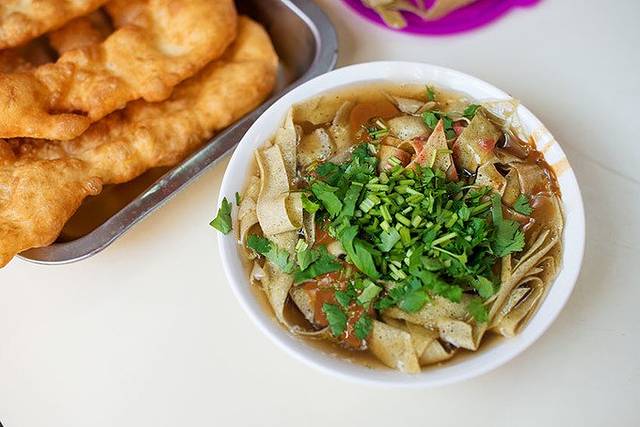 一碗地道锅巴菜,一份炸油饼,便宜美味接地气。IU酒店-天塔店