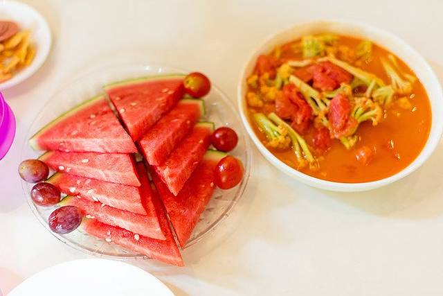 服务生是40多近50的大姐,告诉我们没有果盘出售,只有西瓜汁,又去问了经理,没想到上来一大份西抬头,还点缀了小西红柿,葡萄。