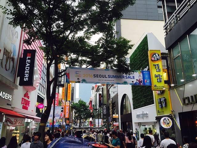 幸好雨停了,但还是感觉空气湿湿的。明洞就跟听说的一样,人真的好多啊!路边有好多小吃,而且每个店里都有会说中文的职员真的被吓到了。