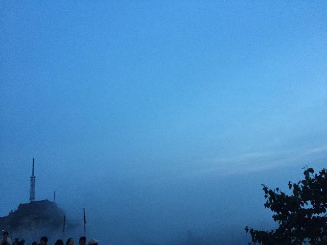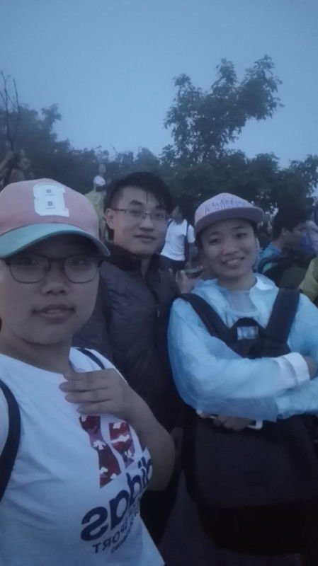 我们一直爬,中途歇了3、4次,然后到了一个休息集中地,原以为这边就是观日之处,然后小贩们说前面门关了,不让向前走,在这边租大衣休息!然后先到的俩人租了2个大衣,还送了个防潮垫,10元一个。本来爬山就是体力活,这一路,大部分男的赤膊上阵,汗流浃背!7月正好夏天,我在山顶还赤膊呢,后来歇了一会,套了件外套,就不感觉冷了!如果有人从山下租个大衣上来,我只能佩服他的勇气了!