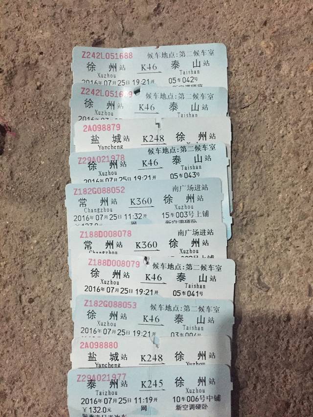 这是火车票集锦图,都是高中时候的老朋友,我提了下爬泰山,都很给面子,于是我们三路(常州、泰州、盐城)汇军于徐州,然后我们一起坐火车到达泰山站。这各个时间的选择需要注意互相平衡,另外,也要考虑到晚点问题。当时我从泰州去徐州的火车开始就晚点半小时,路上又接了盐城的俩个小伙伴,而我们俩个火车间隔时间只有45分钟。其实,我们需要准备备用方案,火车晚点这是铁路部门的失误,我们不应该为此埋单,如果我们需要转车而且因为火车的延误,可以在火车上找到列车长,要他改签或者免手续费退票,如果仅仅剩下几分钟,站内乘车可以赶得上,可以让他打个证明,问站内工作人员,到下一列火车的站台。请转车的注意俩车之间的距离和备用方案