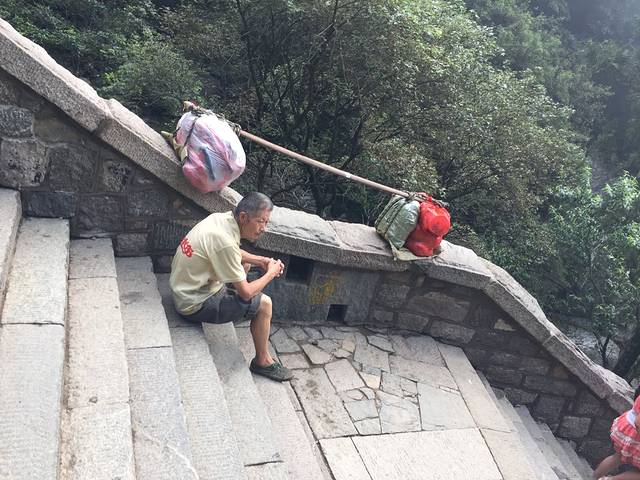 泰山的挑夫,看着都好累,有游客问他吃的卖不卖,他沉默了,可能因为累了,可能是有难言之隐吧~