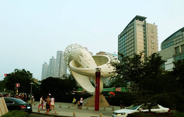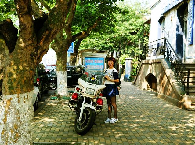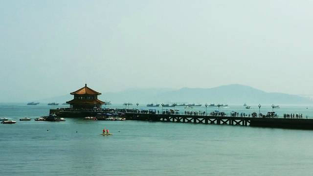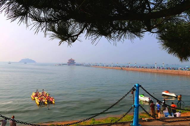 第二天清晨,天气依旧炎热,还是去海边吧,那里也许凉快些。出发去栈桥,远远就看见栈桥上各种旅游团的旗帜,人山人海。在远处匆匆拍了几张,就改道去江苏路了。